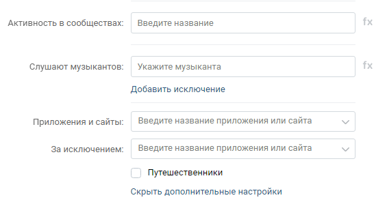 Незадолго до запуска в настройках рекламного кабинета Вконтакте появилась возможность таргетироваться на людей, слушающих определённых музыкальных исполнителей. Реклама работает, если у музыканта собралось не менее 500 слушателей за три месяца (сейчас в базе около 50 тысяч артистов) и эта аудитория слушателей постоянно обновляется.