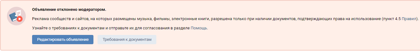 А вот на музыку и видео оформить авторское право вконтакте нужно. Как это делается? В первые с этим вопросом я столкнулась, когда делала таргетированную рекламу для группы начинающего рэп-исполнителя. Нами была оформлена группа рэп вконтакте с нуля, мною подобрана целевая аудитория для промопоста, но объявление не прошло модерацию: