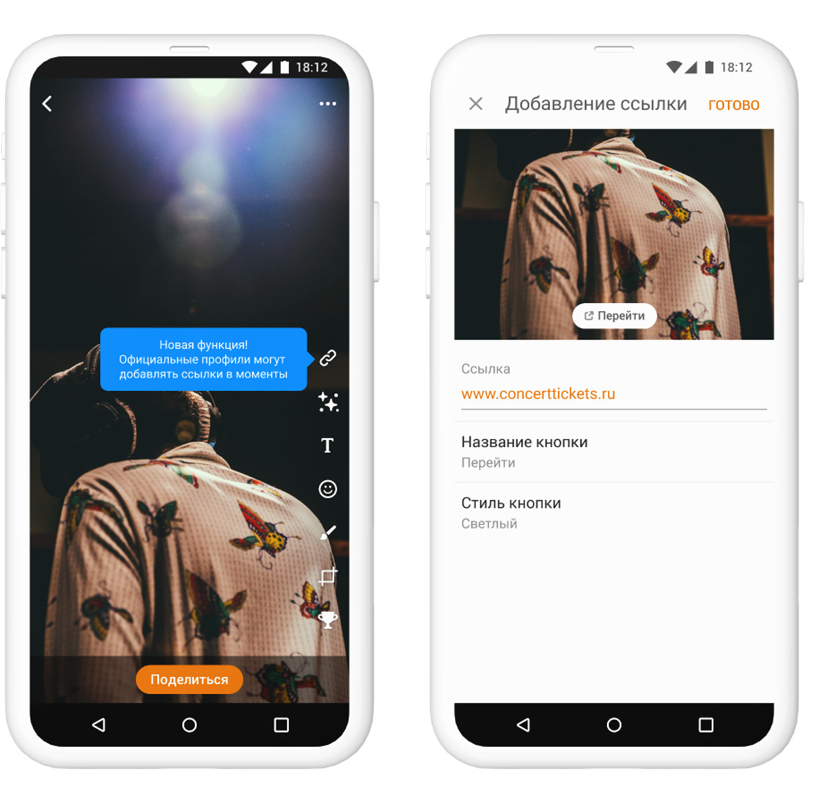 Новый сервис позволяет прикреплять кнопку с ссылкой на любые сайты, блоги, страницы в интернете или внутри ОК. С помощью ссылок в «Моментах» авторы смогут привлекать внимание к своему контенту, анонсировать концерты и встречи с фанатами, рассказывать об акциях любимых брендов, продвигать услуги и товары.