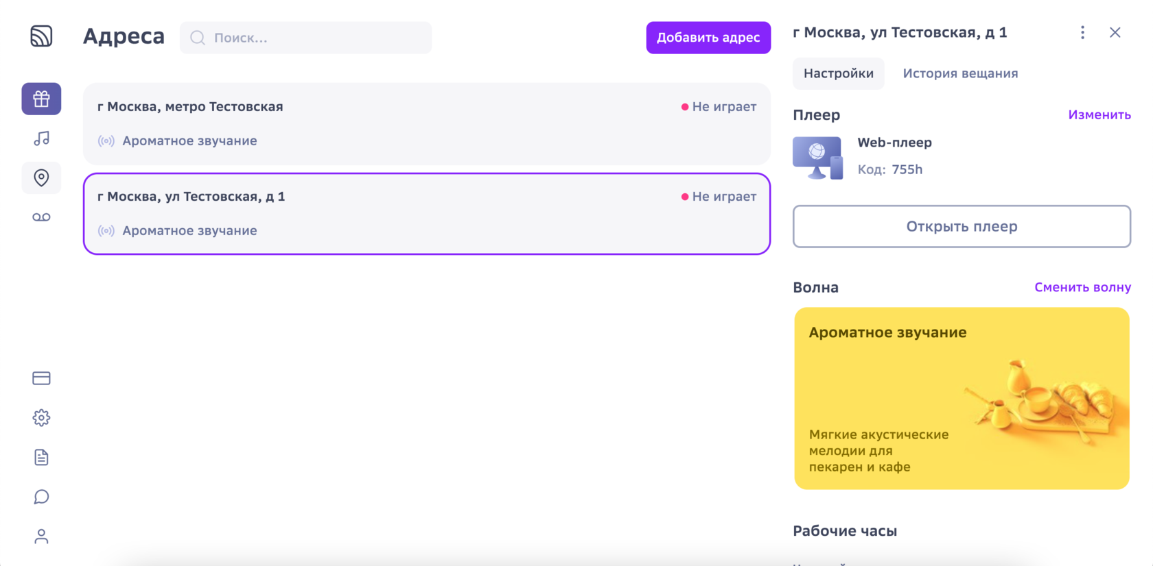 - Чтобы активировать плеер откройте личный кабинет Звук Бизнеса и зайдите в раздел адреса.