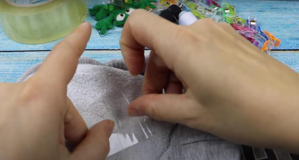 Для работы понадобится не только нитка с иголкой, но и кусок скотча. Для начала с изнаночной стороны на место, где располагается дырка, аккуратно наклеивается скотч. Ткань при этом должна лежать ровно.