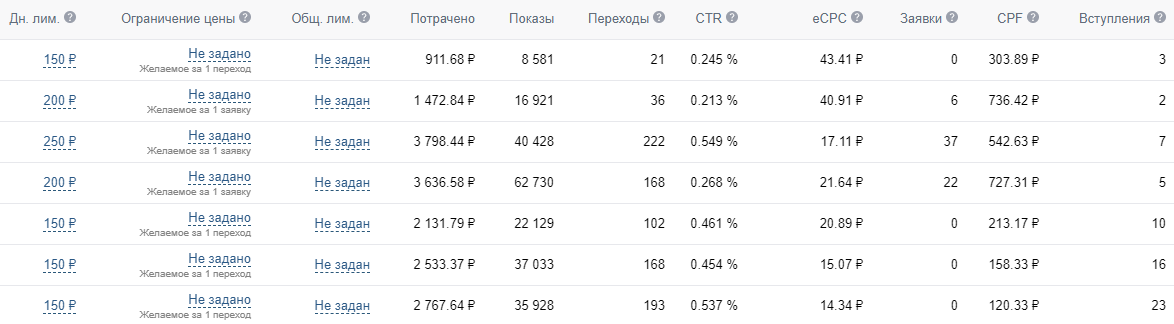 Целью кампании в приведенном выше примере были заявки. Логика кампании заключалась в том, чтобы протестировать несколько сегментов различных аудиторий, отключить неэффективные и сохранить лучшие.