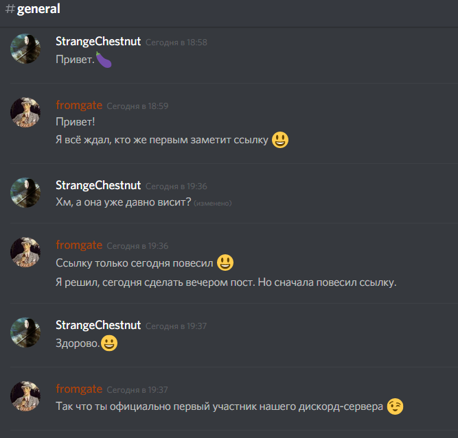 Вот ссылка на дискорд-сервер: https://discord.gg/hEpK2Xm Кстати, пока я собирался с духом, чтобы написать этот текст, я разместил в группе эту ссылку. Было интересно, заметит ли её кто-нибудь. И у нас есть официально первый участник (администраторов группы, естественно, не считаем :-)). Это StrangeChestnut!