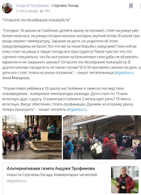 Также нам стало известно, что в одной из школ Подмосковья пробовали обязать родителей покупать медицинские маски детям. Но ситуация разрешилось жалобой в Отдел образования. На сегодняшний день маски в свободной продажи в Подмосковье либо отсутствуют, либо стоят в тридорога, не смотря на обещания президента взять под контроль необоснованное повышение цен на средства индивидуальной защиты.