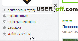 Далее наводите курсор на нужную вам группу, открывается список, в котором ищите пункт «Выйти», и нажимаете на него.