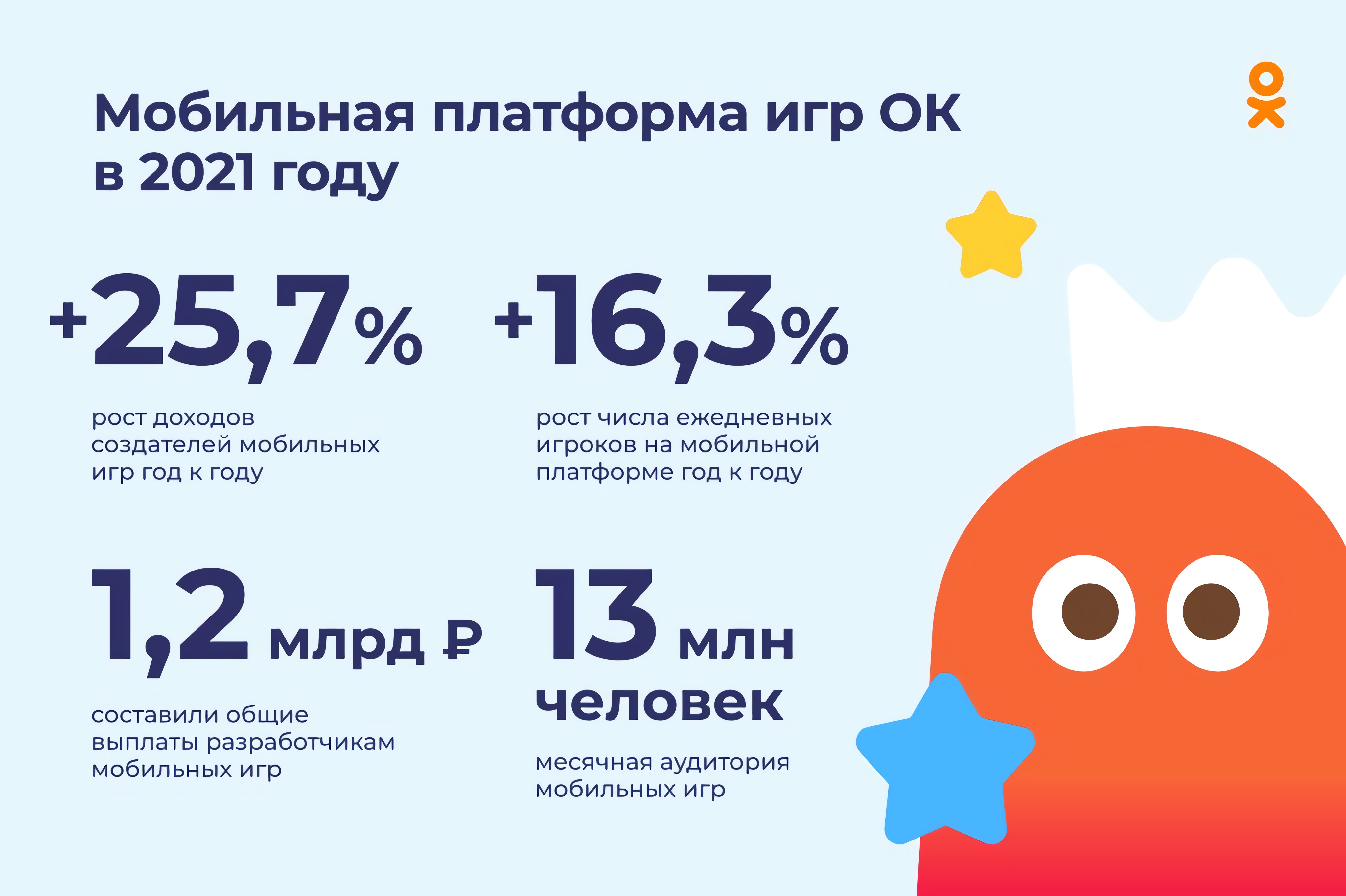 Социальная сеть «Одноклассники» подвела итоги года своей игровой платформы. Общие выплаты разработчикам игр по итогу 2021-го составили 3,2 млрд ($43,4 млн). Треть указанной суммы — 1,2 млрд рублей ($16,3 млн) — пришлась на мобильные проекты.