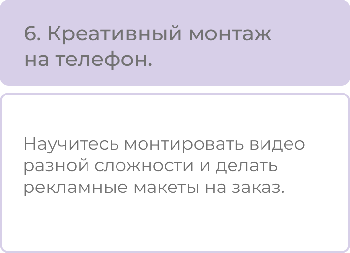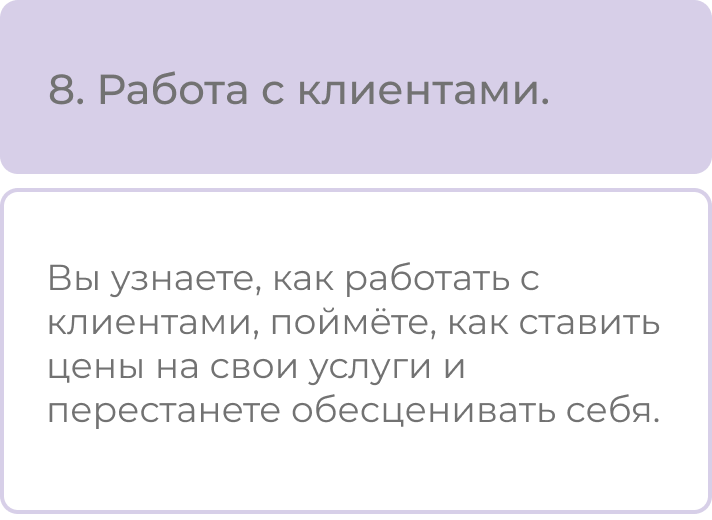 Вы начнёте работать с клиентами, составлять договор, научитесь ставить цены на свои услуги и перестанете обесценивать себя.
