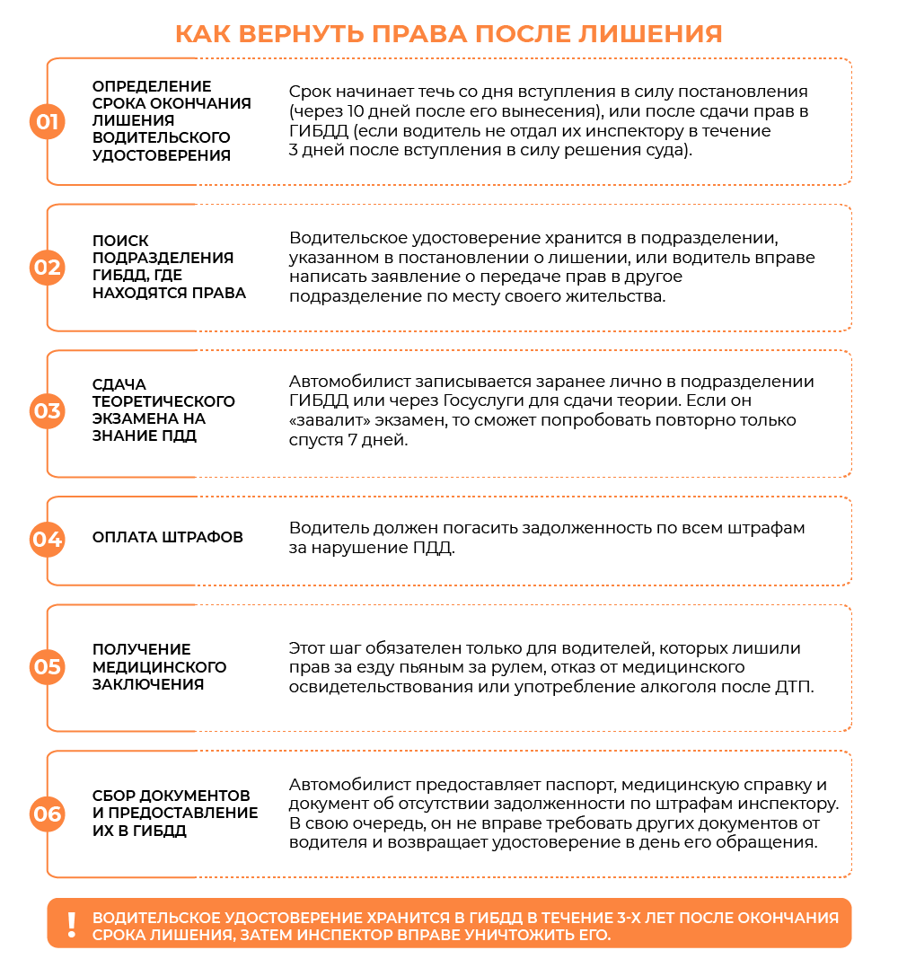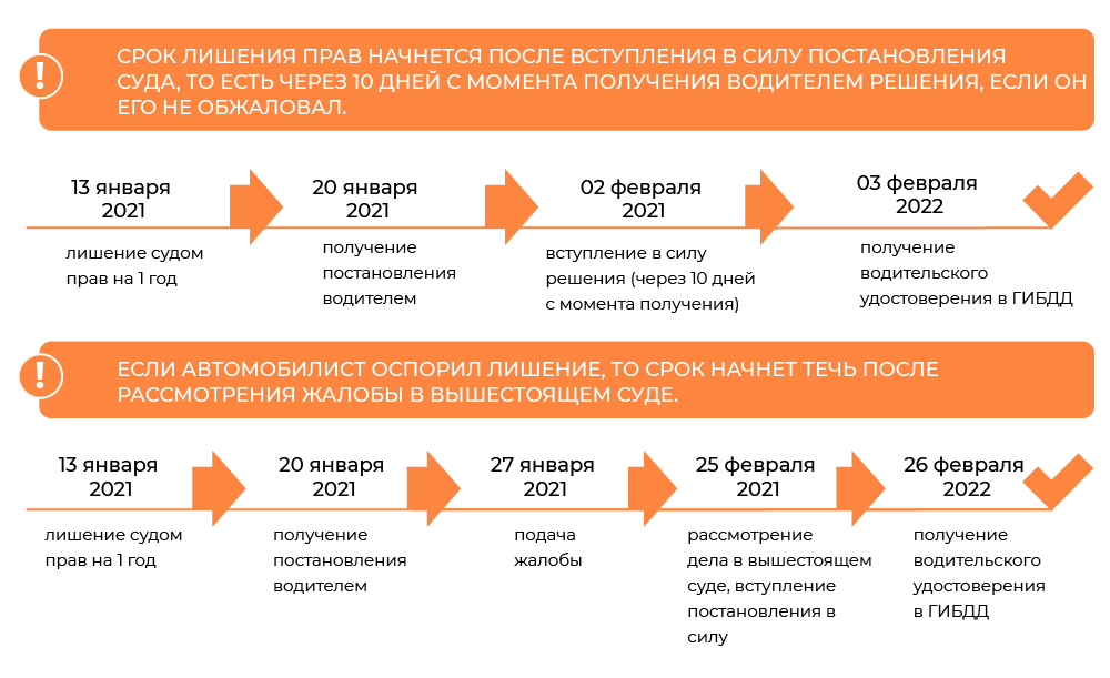 Срок лишения прав начинает течь через десять дней после получения водителем постановления. При подаче им жалобы — после вынесения решения апелляцией. Если затем в течение трех дней водитель не отдаст «корочки» ГИБДД, то срок приостановится. Возобновится только после того, как инспектор получит от автомобилиста водительское удостоверение. Чтобы в дальнейшем снова вернуться за руль, придется по новой сдать теоретический экзамен на знание ПДД, оплатить все штрафы, а в некоторых случаях предоставить в ГИБДД медицинскую справку.