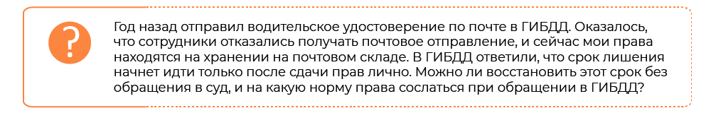 Адвокат и автоюрист Сергей Радько отвечает, что поскольку удостоверение в ГИБДД не поступило, оно фактически не сдано. Ведь водитель даже не подал заявление о его утрате. Поэтому срок лишения начнет течь только после обнаружения его на почте либо получения в ГИБДД заявления об утрате.