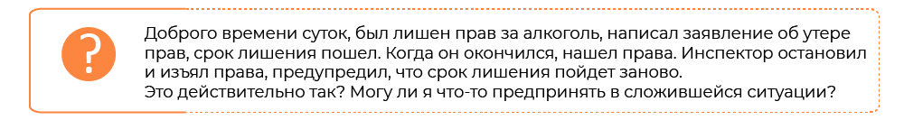 Адвокат и автоюрист Сергей Радько поясняет, что в этой ситуации инспектор неправ. Ведь водитель подал заявление об утере вовремя. Соответственно, срок лишения начал течь и истек. Но утраченное, а впоследствии обнаруженное удостоверение все равно нужно сдать в ГИБДД как недействительное.