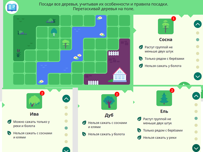 Такие задания на посадку деревьев часты на учи ру и многие ребятишки уже «собаку съели» на этом задании и могут сажать деревья даже не обращая внимания на признаки и свойства, потому что выучили их наизусть. Но здесь, я напомню в каком случае какое дерево сажается, чтобы многим было и в следующий раз легко пройти этот уровень. Так, смотрим ниже на перечисление признаков и потом еще ниже на примерный план посадки деревьев у реки.