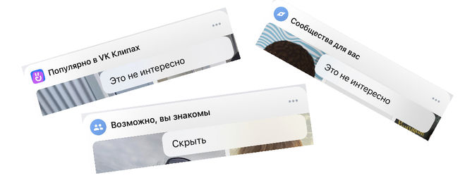 Раньше во ВКонтакте до обновления писали «возможные друзья», теперь появляются уведомления «рекомендованные друзья», «популярно в клипах», «сообщества для вас» если вы пользуетесь мобильным приложением ВК, то попробуйте при появлении рекомендаций нажимать на «три точки» и скрывать эти рекомендации или нажимать «это неинтересно». Поверьте, они будут появляться реже. Чем чаще вы пользуетесь этой соцсетью, тем чаще «нейросеть ВК» будет пытаться вас с кем-нибудь связать — по общим контактам, общим интересам и сообществам, по общим геометкам.