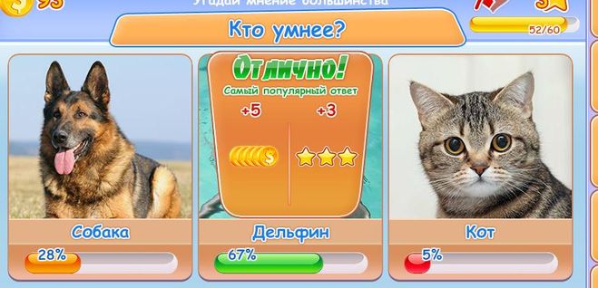 Изначально при выборе самого умного кота я не рассматривала, ведь кот из всех хуже всего поддается дрессировке он всего набрал 5%, а вот собака хоть и умная но набрала только 28%, в битве за самого умного лидирует дельфин он получил 67%.