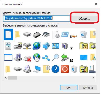 Скачайте архив со значками здесь, распакуйте его. Далее щелкните правой кнопкой по созданному элементу и в меню выберите «свойства». Окно свойств откроется на вкладке «документ интернета», где Вы должны выбрать кнопку «сменить значок». В окошке «смена значка» Вам будет предложен выбор из ряда стандартных иконок, но они нам не интересны.