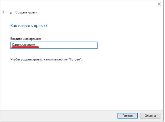 После того, как установите путь к браузеру и адрес сайта нажмите «далее». В следующем шаге задайте имя «одноклассники» (вбивайте без кавычек) и нажмите «готово». Ярлык с названием «одноклассники» появится на рабочем столе.