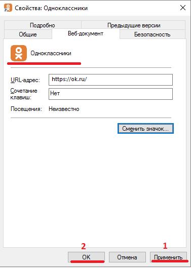 Примечание: если установлена Opera, то при использовании этого метода, ярлык Одноклассники будет функционировать, но всегда будет открываться через Оперу. Исчезнет возможность смены иконки и назначения горячих клавиш.