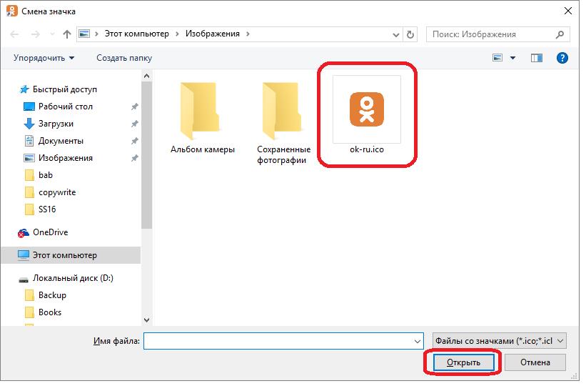 Чтобы установить свой значок ярлыку одноклассников, выберите «обзор», укажите путь до файлов с архива. Все файлы имеют расширение (.ico), выберите понравившейся, затем нажмите «открыть» и OK.