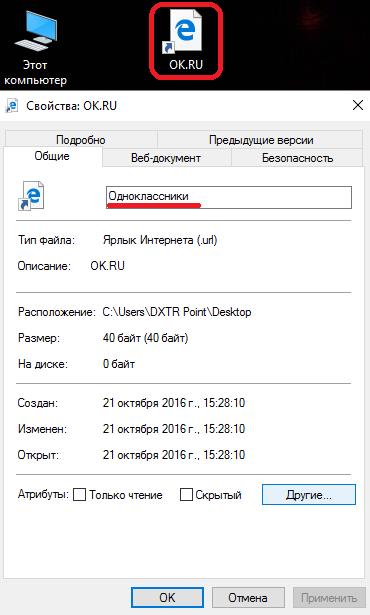 Сейчас нажимаем левую кнопку мыши и перетягиваем курсор на пустую часть рабочего стола. Возникнет еще один значок с: «ОК.RU». Нажимаем на него и открывается соцсеть Одноклассники. Вы можете сменить наименование ярлыка с помощью «Свойств»: