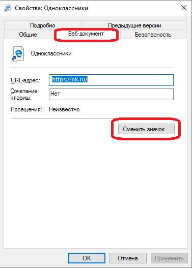 По желанию Вы можете, сменить иконку или назначить горячие клавиши своему значку, как описано выше. Только за место вкладки «документ интернета» здесь будет «ярлык». Неплохо бы еще снять стрелки с ярлыков для представления значка одноклассников в полной красе.