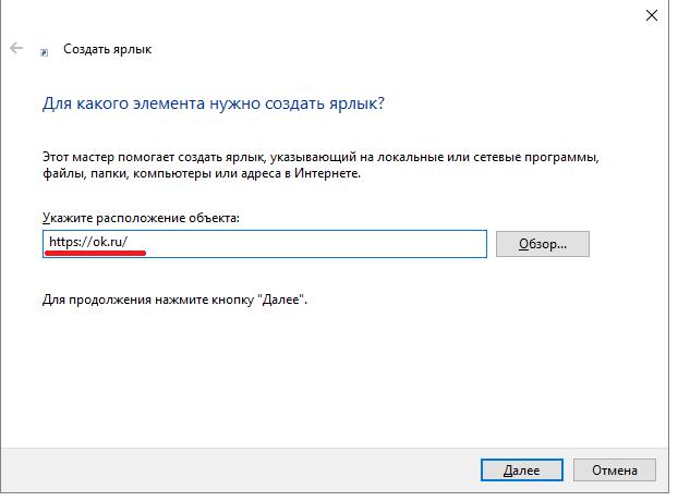 Возник запрос на адрес главного объекта — тут необходимо набрать https://ok.ru/ , затем нажимаем на кнопочку «Далее»: