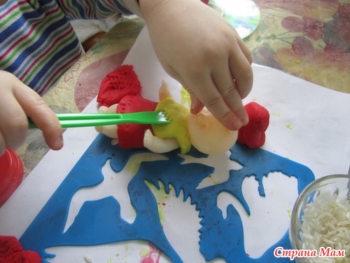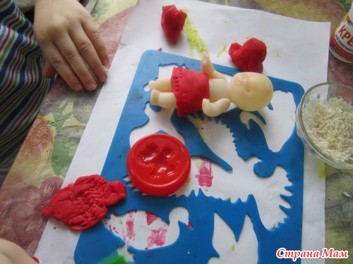 он оказывается еще и дизайнер, куклу одевает. в тесто.