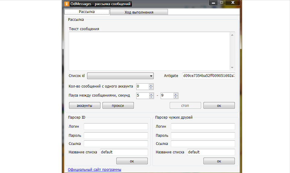 Еще одна известная программа OdMessages позволяет легко формировать нужные базы людей и рассылать им личные сообщения. Встроенный рандомизатор в соответствии с правилами сайта выдерживает паузу между отправкой и не разрешает превышать лимит отправки. Такая система помогает избежать блокировки аккаунтов и не допустить пометок системой сообщений в качестве спама. Кроме того софт собирает id пользователей для проведения тематических рассылок, поддерживает списки пользователей и номера прокси, что позволяет избежать перезапуска программы в процессе работы.