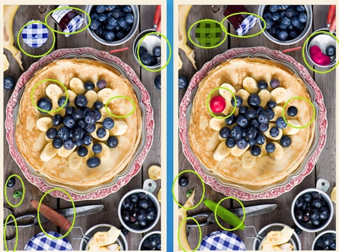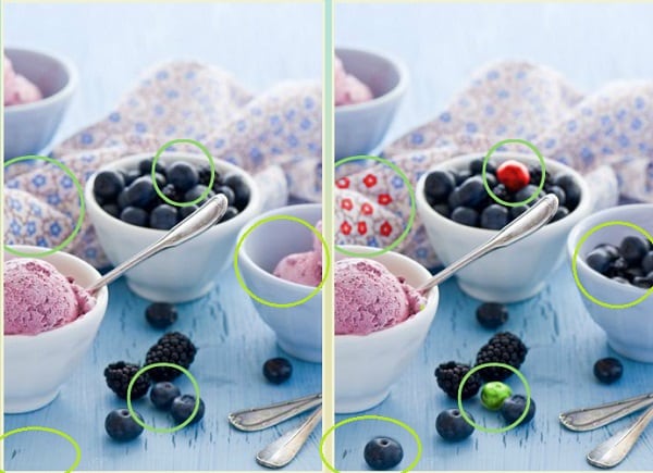 - Отсутствующую ягоду в левом нижнем углу и черенок другого цвета у ложки.