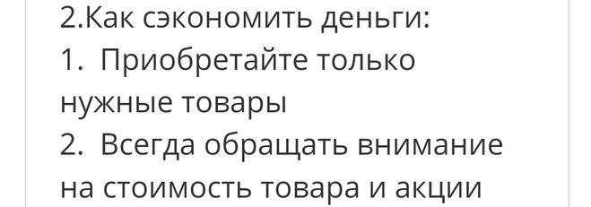 Чтобы сэкономить деньги, нужно составить список предстоящих покупок. В список нужно внести то, что тебе действительно необходимо. Будет полезно, если ты предположишь цену товаров и так ты можешь взять с собой строго ограниченную сумму и ее придержиться при совершении покупок. Если не отвлекаться от списка и покупать строго по нему, то ты не купишь ничего лишнего.