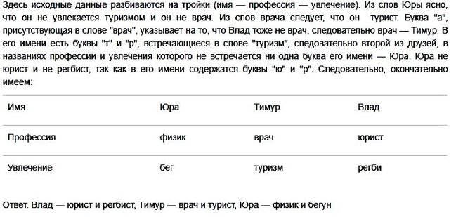 Юра не занимается туризмом, а турист — это врач. Значит, Юра не является врачом и не увлекается туризмом, как сказано в условиях задачки. В слове «врач» есть буква «а», значит, это не Юра и не Влад. Получается, Тимур врач и увлекается он туризмом.