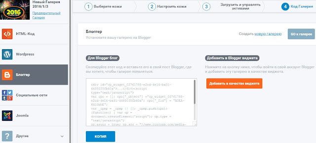 Перейдите к шагу 4 при помощи кнопки Next. И выберите вариант вставки Вашей фотогалереи — в пост или в гаджет. Скопируйте и вставьте соответствующий код в Blogger.