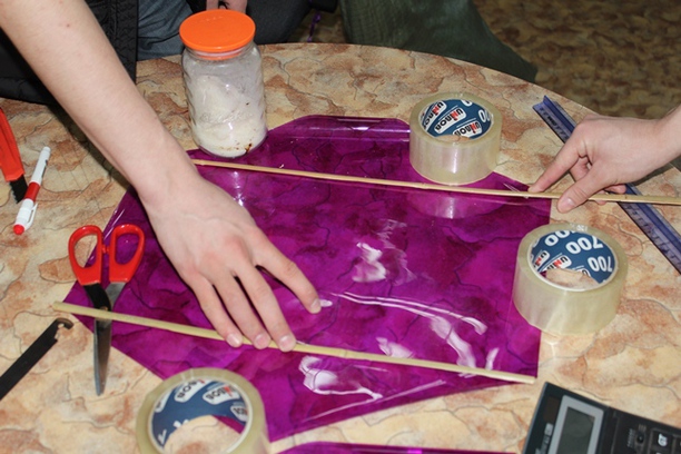 Материал может быть подобран по вашим возможностям: полиэтилен, ткань или простая бумага. Необходимы две тонкие и легкие рейки, которые в зависимости от материала могут быть прикреплены к воздушному змею с помощью скотча или вшиты в материал. В качестве реек можно использовать все что угодно, трубочки от коктейля, воздушных шариков или деревянные рейки.