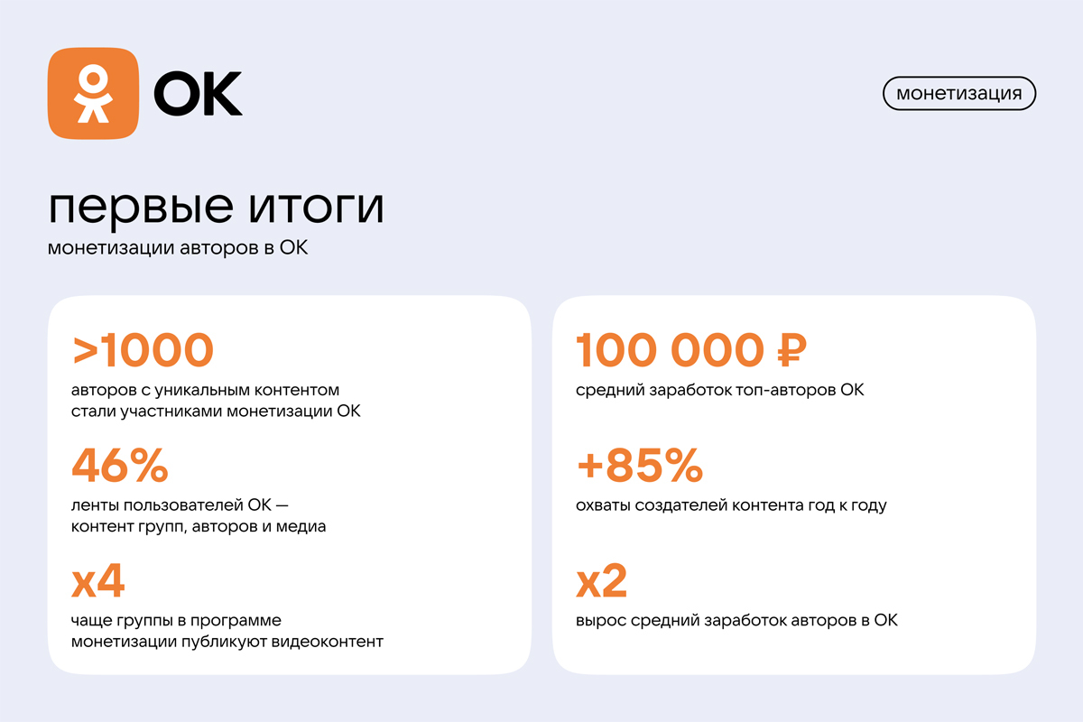 Благодаря новым программам монетизации авторы в ОК стали зарабатывать в два раза больше в сравнении с доходами от прежних партнерских программ. Общая сумма ежемесячных выплат авторам от ОК выросла год к году на 160%, средний доход одного автора в месяц — на 99%.