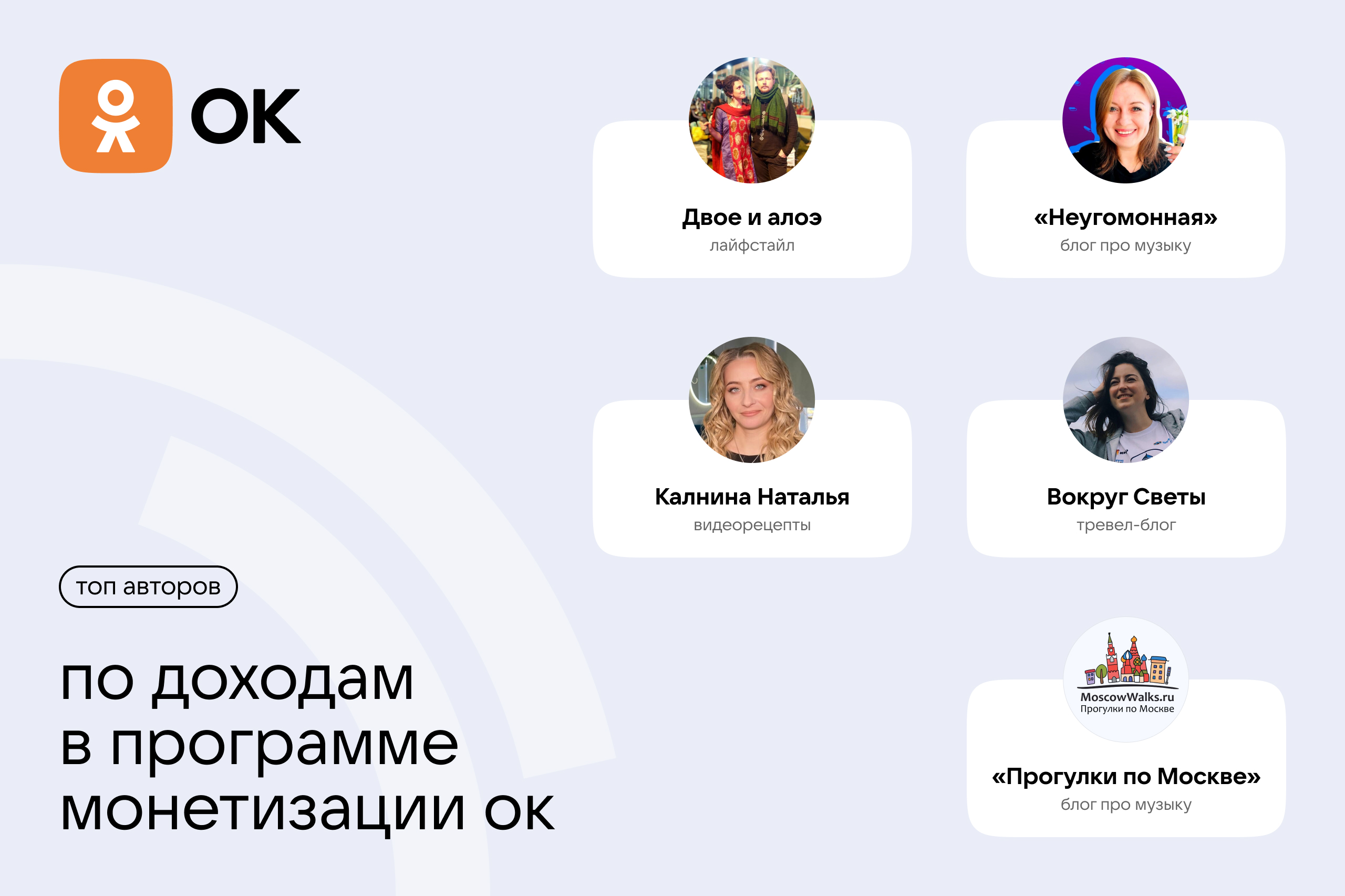 В программах монетизации ОК больше всего зарабатывают авторы с блогами о наиболее популярных увлечениях пользователей: путешествия, авто, кулинария, юмор, дом и сад. Лидерами по доходам с момента запуска обеих программ монетизации стали блог про музыку «Неугомонная», тревел-блог Вокруг Светы, видеорецепты Калниной Натальи, лайфстайл-группа Двое и алоэ, официальная группа проекта «Прогулки по Москве» Александра Усольцева.