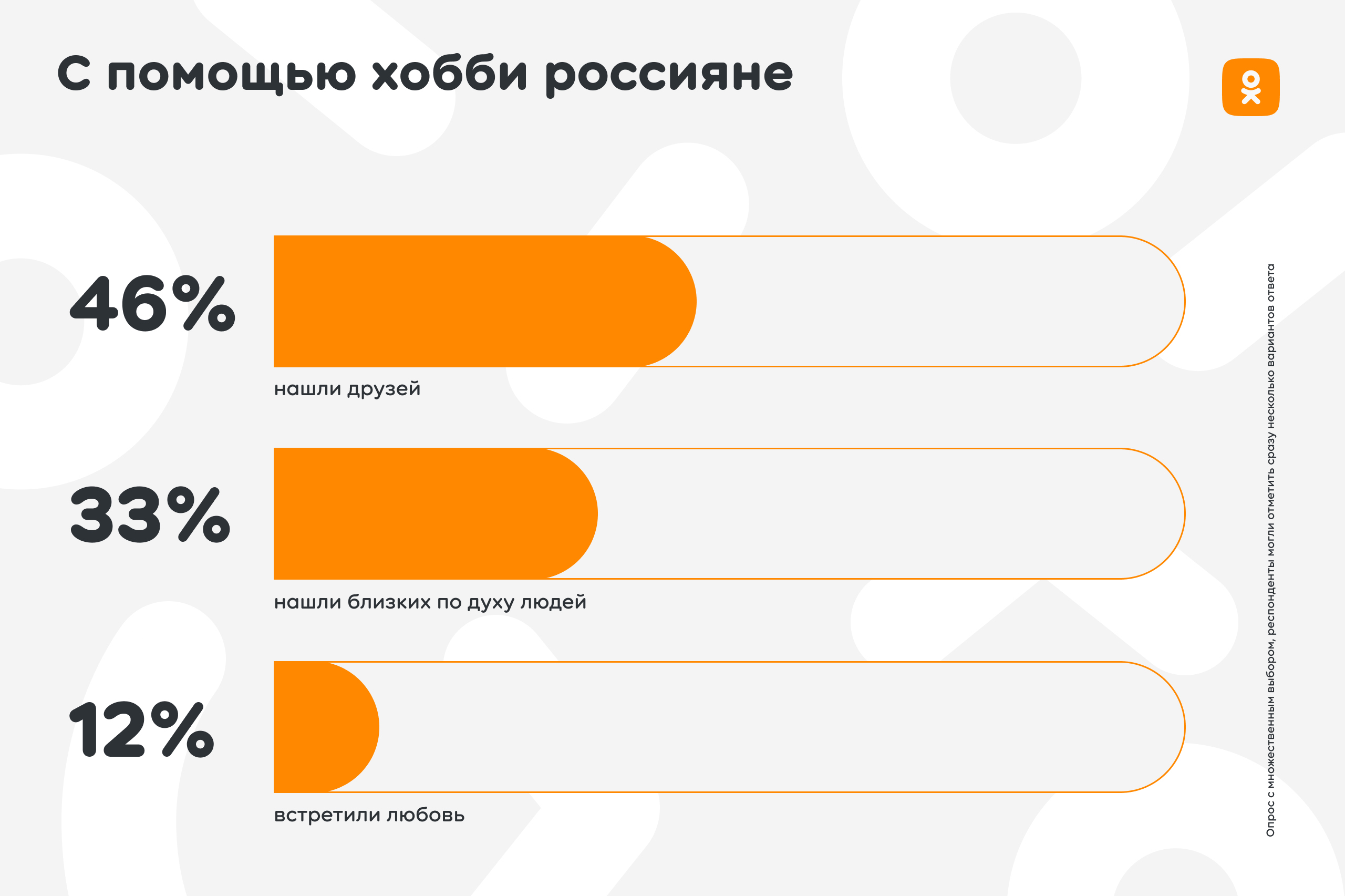 ОК проанализировали, как связаны увлечения и социальные связи людей. Например, почти половина (46%) участников исследования нашли c помощью хобби друзей, треть (33%) — близких по духу людей и единомышленников, другие 12% россиян благодаря общему увлечению обрели любовь и начали встречаться со своими вторыми половинками.