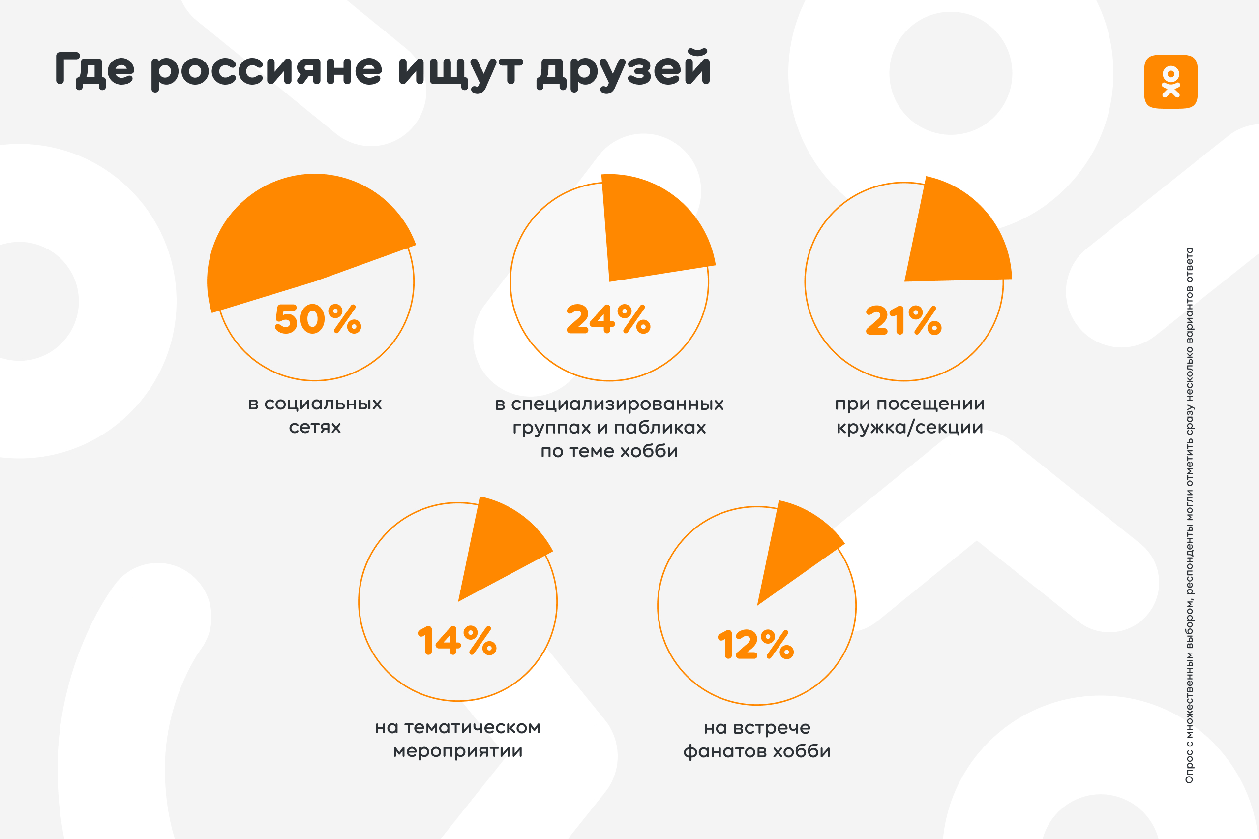 И всё же, многие россияне испытывают потребность в поиске друзей по интересам — об этом заявили 42% опрошенных. Каждый второй (в 50% случаев) старается найти единомышленников в социальных сетях, в специализированных группах и пабликах по теме хобби (в 24% случаев) или посещает кружки и секции (в 21% случаев).