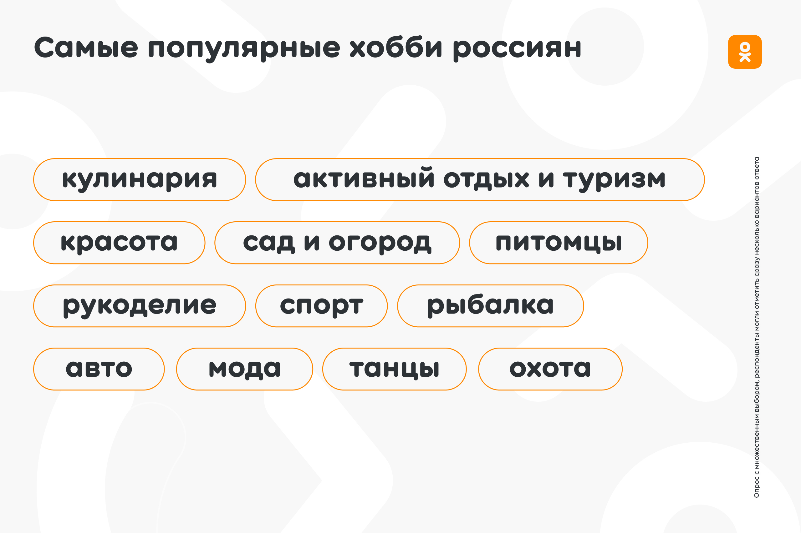 ОК определили, что у большинства (95%) россиян, помимо работы, бытовых дел и воспитания детей и внуков, есть собственные увлечения. Кроме того, каждый второй (51%) опрошенный заявил, что иметь хобби и заниматься чем-то «для себя» — обязательно и очень важно. А 38% участников исследования рассказали, что всегда занимаются своим хобби в свободное от работы время.