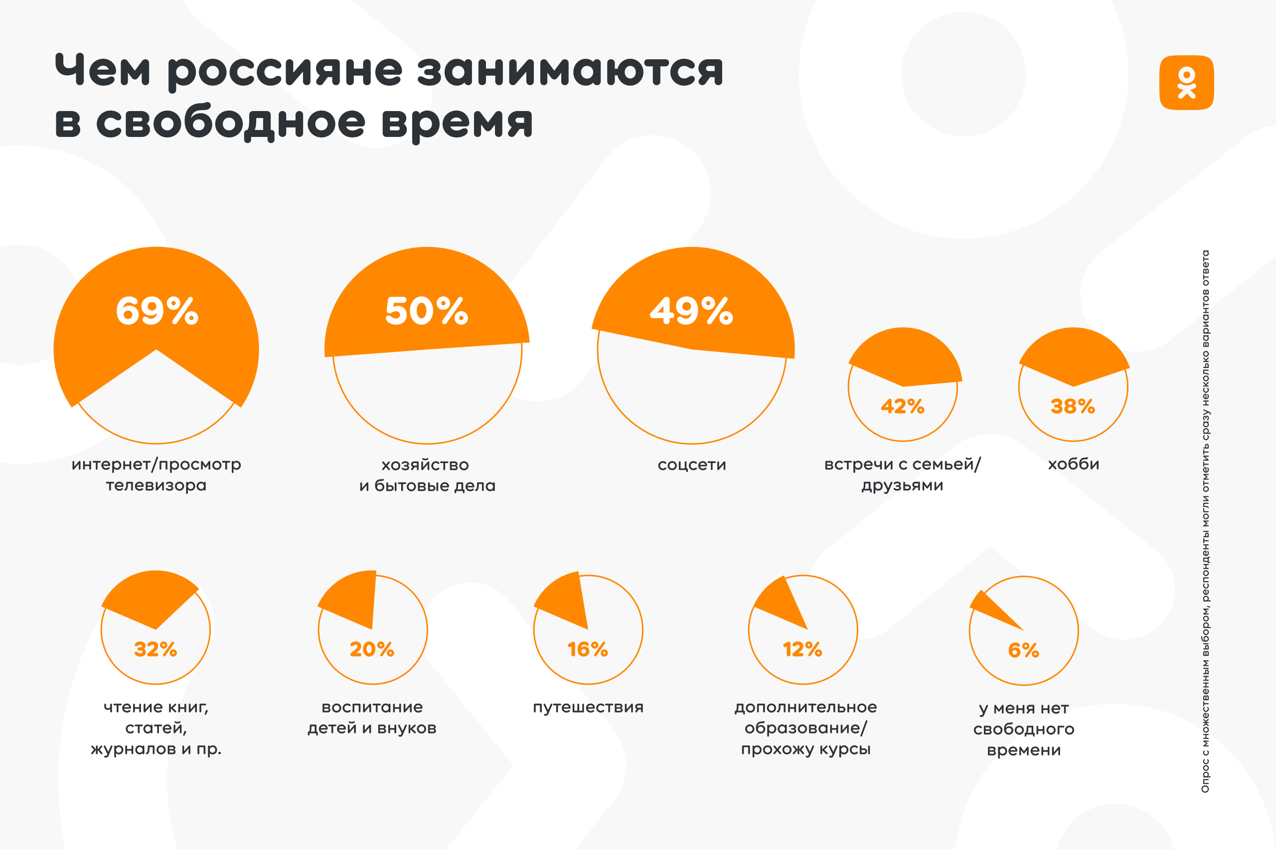 Помимо хобби у россиян есть и другие любимые занятия. Например, просмотр телевизора и интернет-сёрфинг (в 69% случаев), поиск новой информации и друзей в социальных сетях (в 49% случаев), встречи с родными и знакомыми (в 42% случаев). Об отсутствии свободного времени и каких-либо дел вне работы респонденты говорили лишь в 6% случаев.