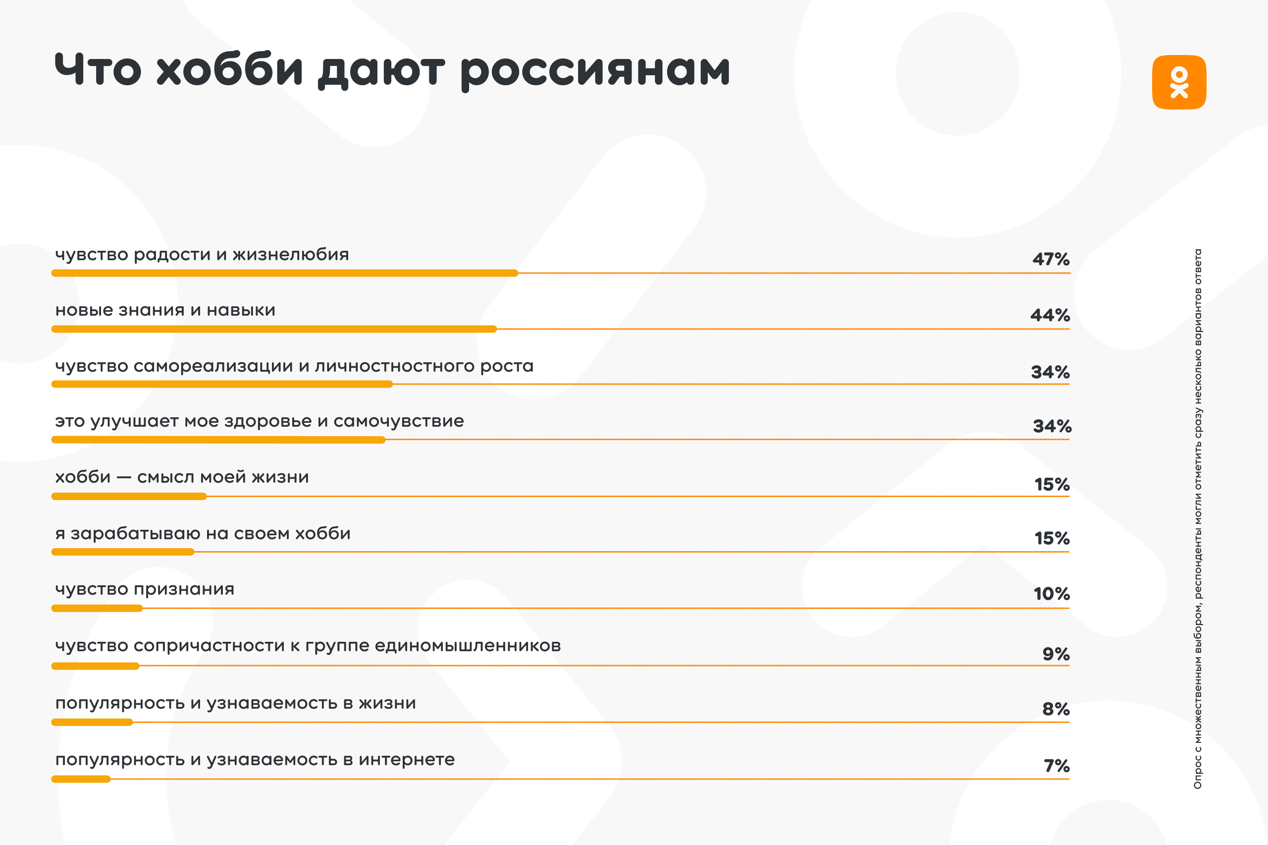 Также в компании узнали, зачем жители России находят новые увлечения и стараются их развивать. Например, в 47% случаев респонденты делились, что хобби приносит им чувства радости и любви к жизни, новые знания и навыки — в 44% случаев, чувство самореализации и личностный рост, а также хорошее самочувствие — в 34% случаев. Нередко россияне говорили даже о том, что хобби — смысл их жизни (в 15% случаев).