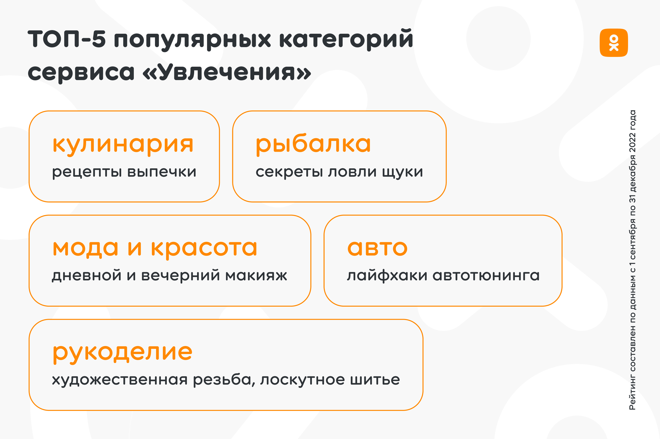Кроме того, ОК проанализировали самые популярные категории в собственном сервисе «Увлечения» с сентября по январь. В топ-5 вошли кулинария, мода и красота, авто, рыбалка и рукоделие. В рамках категорий чаще всего смотрят рецепты выпечки, лайфхаки автотюнинга, дневной и вечерний макияж, секреты ловли щуки, художественную резьбу и лоскутное шитье.