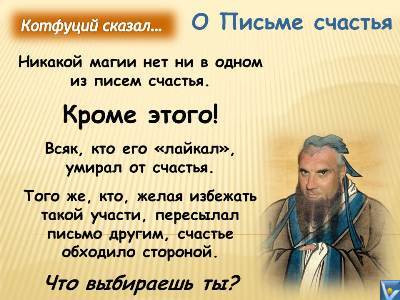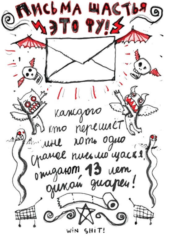 Поверьте, если бы всё было так просто, то сколько счастливых людей было бы на земле. Разослал письмо счастья — оп, и ты уже счастливый. А так я эти письма бы назвала не «письма счастья», а «письма для дураков» или «письма для лохов».