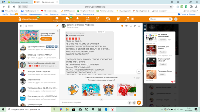 Сижу я вчера вечером, работаю и тут система оповестила меня о том, что в «Одноклассники» пришло сообщение от родственницы. Оно было следующего содержания: «19:39