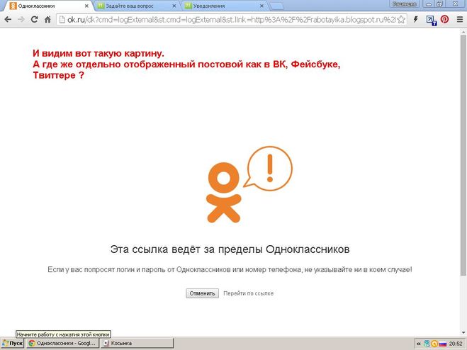 Теперь проведём анализ твоих ошибок. Она у тебя всего одна. Ты кликал на заметку в общей ленте, а не открывал её в отдельном окне. Поэтому у тебя копировалась размещённая в заметке ссылка на наш блог . И,опять же поэтому, когда ты эту ссылку вставлял в поиск, то появлялось предупреждение, что она ведёт за пределы ОК. И это правильно!