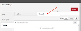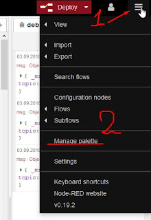 Ну так вот. Прежде всего нам будет нужна нода для соединения с погодным сервисом openweathermap. Чтобы установить новую ноду надо воспользоватся Manage palette (управление палитрой) Node-RED. Находится эта штука здесь: