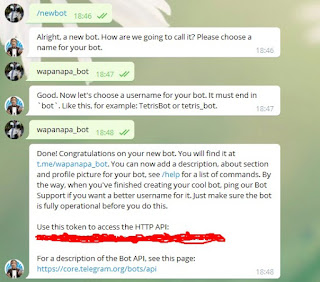 я назвал wapanapa_bot. В ответ бот предложит нам ввести инфо про нашего бота и поздравит с успешным его созданием. Но что самое главное — он даст нам токен бота. Никому его не показывайте, это будет ваш ключ к нему. Токен если что можно будет потом менять.