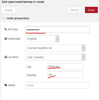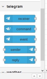 Для того чтобы подключатся к сторонним сервисам в Node-RED, как и для всех остальных действий, используются ноды. К счастью они уже написаны за нас как для телеграма так и для ресурса openweathermap.com. OpenWeatherMap это такой онлайн сервис который предоставляет API для доступа к информации о погоде.