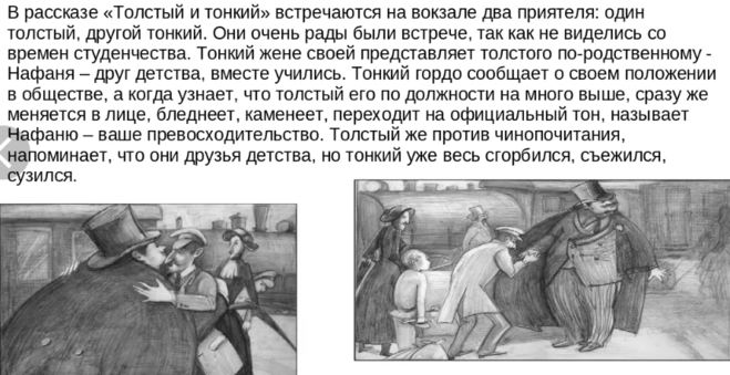 Герои рассказа Антона Чехова «Толстый и Тонкий» встретились на вокзале совершенно случайно. Они были друзьями детства, но жизнь развела, и они долго друг друга не видели. Встрече оба обрадовались, обнялись, расцеловались. Стали вспоминать детство, ну а потом обсудили, кто чего в жизни достиг.