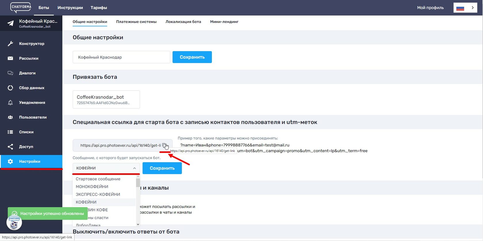 Скопируйте специальную ссылку в разделе Настройки бота. Выберите сообщение, с которого будет запускаться бот при переходе по такой ссылке: со Стартового сообщения, или с любого другого, выбранного из списка.