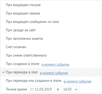 - Например: при создании компании, при пропущенном звонке, при долгом ответе клиенту в мессенджере, при смене ответственного и т.д.