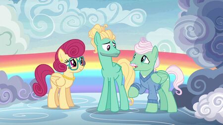 - ↑ Например, когда предстоит в опасной ситуации перенести по воздуху другую пони или в составе пегасьего коллектива обеспечить круговорот воды в природе.