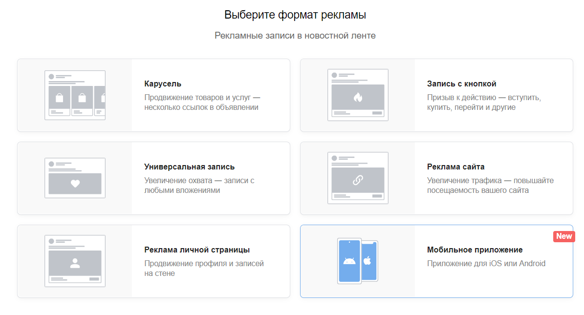 Прежде всего нужно выбрать цель рекламы. В зависимости от выбранной цели рекламная система предложит вам доступные форматы продвижения. Также от цели может зависеть вариант оплаты рекламы: за показ, клик, подписку и т.д.